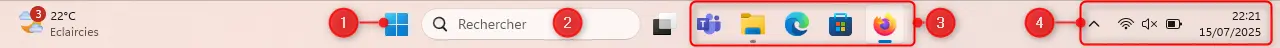 - Une zone de notification à droite, avec l’heure, le son, la connexion internet, la batterie, et parfois d’autres éléments (mise à jour, antivirus, etc.).