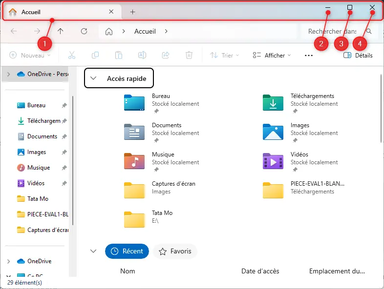 Chaque fois que vous ouvrez un programme ou un fichier, il s’ouvre dans une fenêtre. Une fenêtre est une zone rectangulaire indépendante. Elle possède une barre supérieure (appelée barre de titre) qui contient le nom du fichier ou du programme, ainsi que trois boutons à droite : réduire (un tiret), agrandir ou restaurer (un carré), et fermer (une croix).